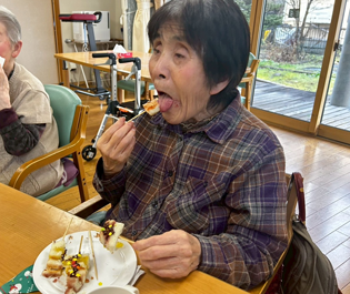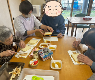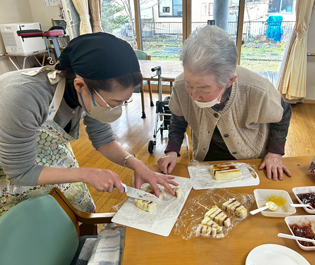 月に1度一般法人ゆにしあ様を招き食リハ「食のリハビリ」を行っています。利用者様が自分で作ったお菓子などをみんなで食べる時間を楽しみにしている行事の1つです。